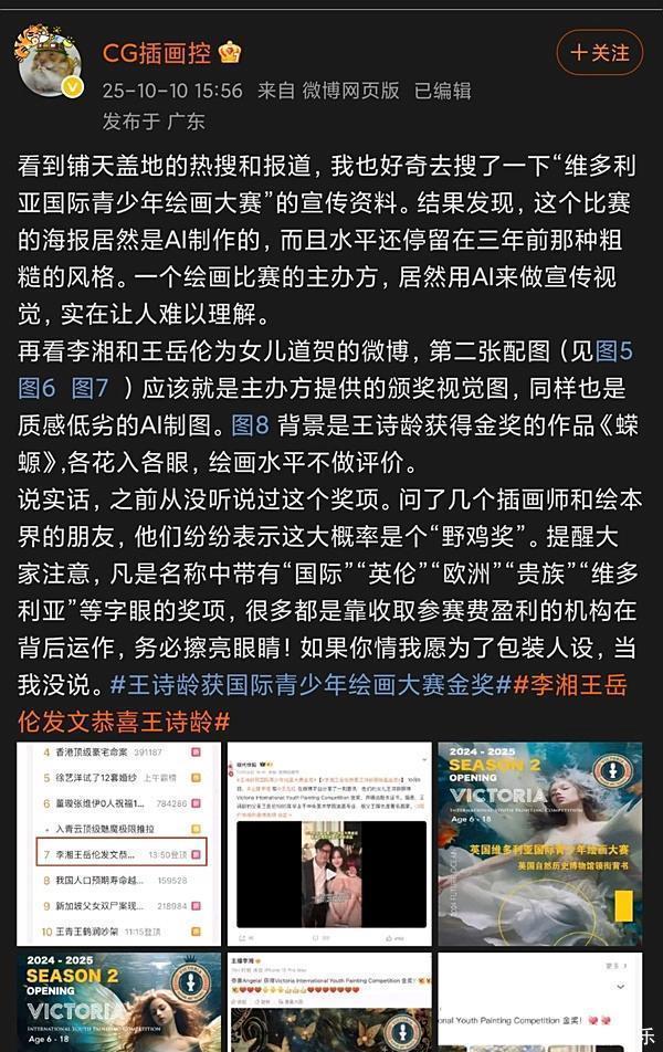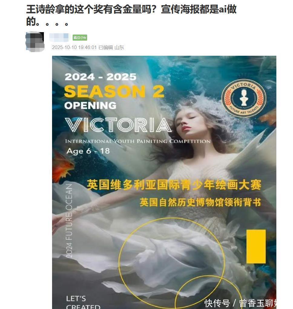 不过,这次获奖却遭到了不少质疑,有网友扒出该奖项的宣传海报疑似是AI做的图,还问了业内朋友,大家也都不知道这个奖项。暗指王诗龄是在“包装人设”。