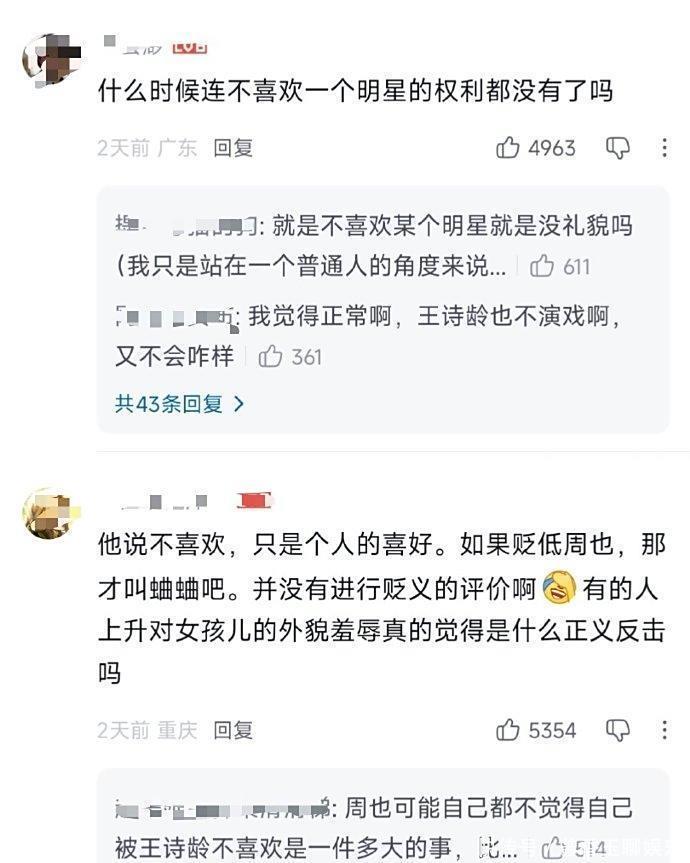 另一拨认为这个声音是否是王诗龄还不能确定,即便是她说的,也只是在跟自己的家人说不喜欢的人,并不是故意要传到网上,但周也的粉丝却故意去网暴王诗龄。
